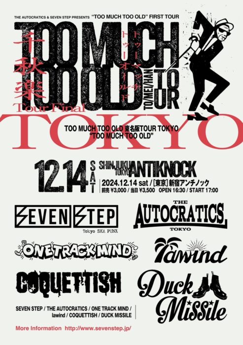 THE AUTOCRATICS & SEVEN STEP presents “TOO MUCH TOO OLD Tour in TOKYO” . adv/door ¥3,000/¥3,500(+1d) . ■BAND■ THE AUTOCRATICS SEVEN STEP ONE TRACK MIND lawind COQUETTISH DUCK MISSILE 読み込んでいます…